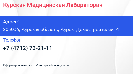 Курская Медицинская Лаборатория по адресу 305006, Курская область, Курск, Домостроителей, 4 в дальнейшем Организация, размещена в следующих категориях: