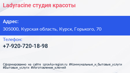Ladyracine, студия красоты по адресу 305000, Курская область, Курск, Горького, 70 в дальнейшем Организация, размещена в следующих категориях: