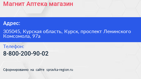 Магнит-Аптека, магазин по адресу 305045, Курская область, Курск, проспект Ленинского Комсомола, 97а в дальнейшем Организация, размещена в следующих категориях: