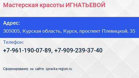 Мастерская красоты ИГНАТЬЕВОЙ по адресу 305005, Курская область, Курск, проспект Плевицкой, 35 в дальнейшем Организация, размещена в следующих категориях: