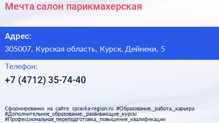Мечта, салон-парикмахерская по адресу 305007, Курская область, Курск, Дейнеки, 5 в дальнейшем Организация, размещена в следующих категориях: