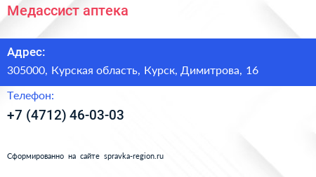 Медассист, аптека по адресу 305000, Курская область, Курск, Димитрова, 16 в дальнейшем Организация, размещена в следующих категориях: