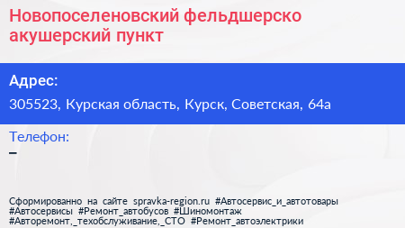 Новопоселеновский фельдшерско-акушерский пункт по адресу 305523, Курская область, Курск, Советская, 64а в дальнейшем Организация, размещена в следующих категориях: