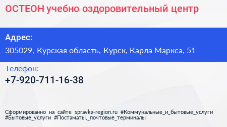 ОСТЕОН, учебно-оздоровительный центр по адресу 305029, Курская область, Курск, Карла Маркса, 51 в дальнейшем Организация, размещена в следующих категориях: