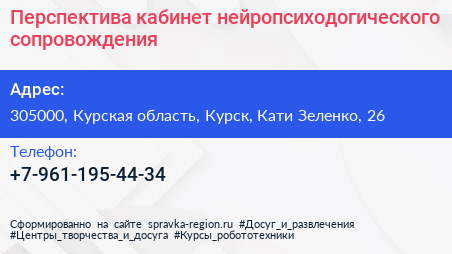 Перспектива, кабинет нейропсиходогического сопровождения по адресу 305000, Курская область, Курск, Кати Зеленко, 26 в дальнейшем Организация, размещена в следующих категориях: