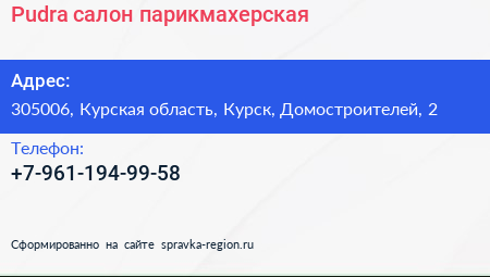 Pudra, салон-парикмахерская по адресу 305006, Курская область, Курск, Домостроителей, 2 в дальнейшем Организация, размещена в следующих категориях: