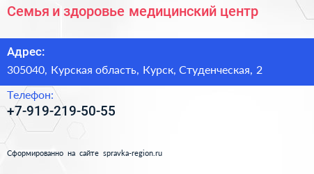 Семья и здоровье, медицинский центр по адресу 305040, Курская область, Курск, Студенческая, 2 в дальнейшем Организация, размещена в следующих категориях: