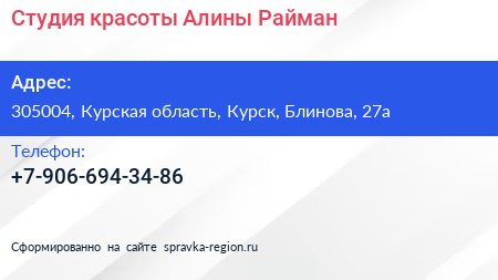 Студия красоты Алины Райман по адресу 305004, Курская область, Курск, Блинова, 27а в дальнейшем Организация, размещена в следующих категориях: