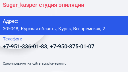 Sugar_kasper, студия эпиляции по адресу 305048, Курская область, Курск, Веспремская, 2 в дальнейшем Организация, размещена в следующих категориях: