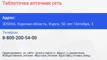 Таблеточка, аптечная сеть по адресу 305016, Курская область, Курск, 50 лет Октября, 1 в дальнейшем Организация, размещена в следующих категориях: