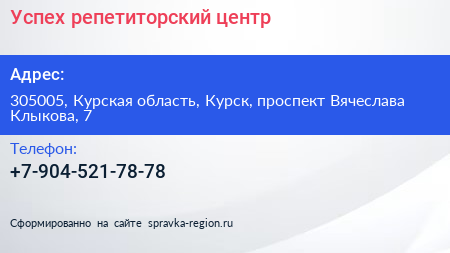 Успех, репетиторский центр по адресу 305005, Курская область, Курск, проспект Вячеслава Клыкова, 7 в дальнейшем Организация, размещена в следующих категориях: