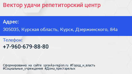Вектор удачи, репетиторский центр по адресу 305035, Курская область, Курск, Дзержинского, 84а в дальнейшем Организация, размещена в следующих категориях: