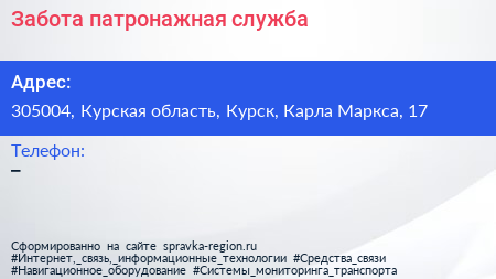 Забота, патронажная служба по адресу 305004, Курская область, Курск, Карла Маркса, 17 в дальнейшем Организация, размещена в следующих категориях: