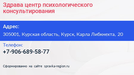 Здрава, центр психологического консультирования по адресу 305001, Курская область, Курск, Карла Либкнехта, 20 в дальнейшем Организация, размещена в следующих категориях: