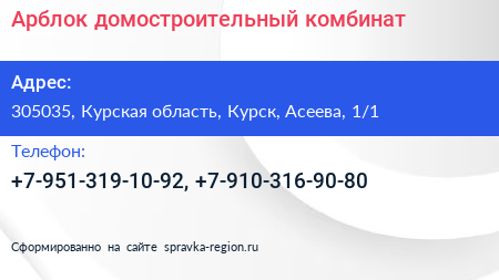 Арблок, домостроительный комбинат по адресу 305035, Курская область, Курск, Асеева, 1/1 в дальнейшем Организация, размещена в следующих категориях: