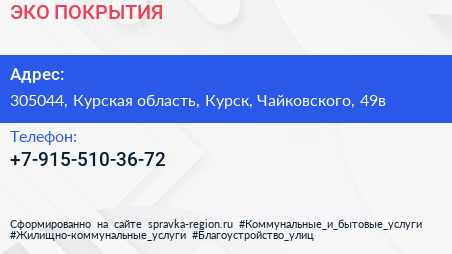ЭКО-ПОКРЫТИЯ по адресу 305044, Курская область, Курск, Чайковского, 49в в дальнейшем Организация, размещена в следующих категориях: