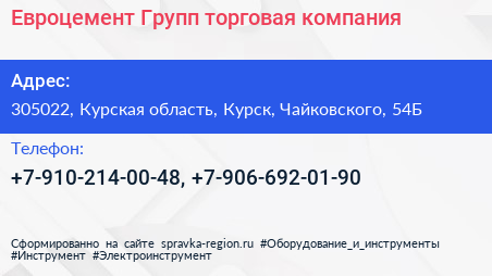 Евроцемент Групп, торговая компания по адресу 305022, Курская область, Курск, Чайковского, 54Б в дальнейшем Организация, размещена в следующих категориях: