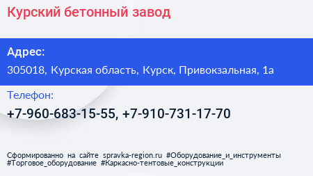 Курский бетонный завод по адресу 305018, Курская область, Курск, Привокзальная, 1а в дальнейшем Организация, размещена в следующих категориях:
