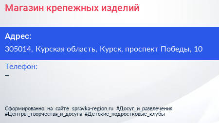 Магазин крепежных изделий по адресу 305014, Курская область, Курск, проспект Победы, 10 в дальнейшем Организация, размещена в следующих категориях: