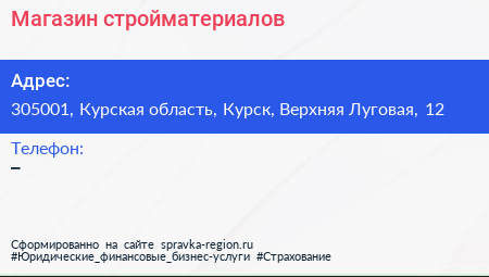 Магазин стройматериалов по адресу 305001, Курская область, Курск, Верхняя Луговая, 12 в дальнейшем Организация, размещена в следующих категориях: