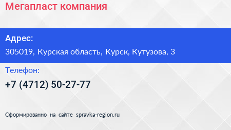 Мегапласт, компания по адресу 305019, Курская область, Курск, Кутузова, 3 в дальнейшем Организация, размещена в следующих категориях:
