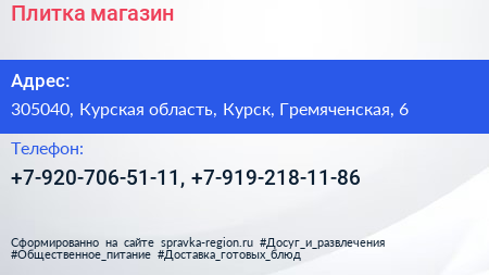 Плитка, магазин по адресу 305040, Курская область, Курск, Гремяченская, 6 в дальнейшем Организация, размещена в следующих категориях: