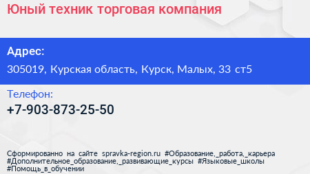 Юный техник, торговая компания по адресу 305019, Курская область, Курск, Малых, 33 ст5 в дальнейшем Организация, размещена в следующих категориях: