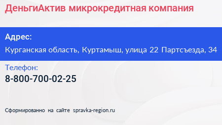 ДеньгиАктив, микрокредитная компания по адресу Курганская область, Куртамыш, улица 22 Партсъезда, 34 в дальнейшем Организация, размещена в следующих категориях: