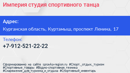 Империя, студия спортивного танца по адресу Курганская область, Куртамыш, проспект Ленина, 17 в дальнейшем Организация, размещена в следующих категориях: