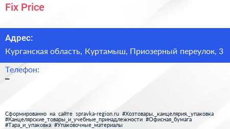 Fix Price по адресу Курганская область, Куртамыш, Приозерный переулок, 3 в дальнейшем Организация, размещена в следующих категориях: