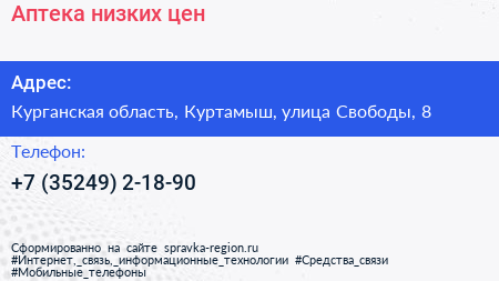 Аптека низких цен по адресу Курганская область, Куртамыш, улица Свободы, 8 в дальнейшем Организация, размещена в следующих категориях: