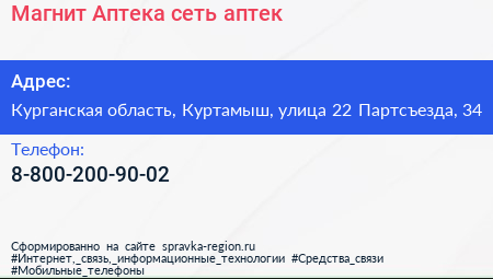 Магнит Аптека, сеть аптек по адресу Курганская область, Куртамыш, улица 22 Партсъезда, 34 в дальнейшем Организация, размещена в следующих категориях: