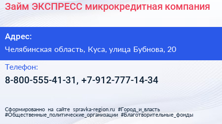 Займ ЭКСПРЕСС, микрокредитная компания по адресу Челябинская область, Куса, улица Бубнова, 20 в дальнейшем Организация, размещена в следующих категориях: