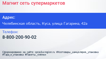 Магнит, сеть супермаркетов по адресу Челябинская область, Куса, улица Гагарина, 42а в дальнейшем Организация, размещена в следующих категориях: