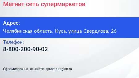 Магнит, сеть супермаркетов по адресу Челябинская область, Куса, улица Свердлова, 26 в дальнейшем Организация, размещена в следующих категориях: