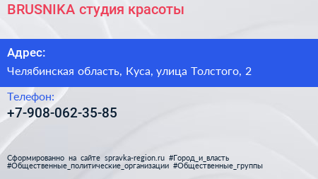 BRUSNIKA, студия красоты по адресу Челябинская область, Куса, улица Толстого, 2 в дальнейшем Организация, размещена в следующих категориях:
