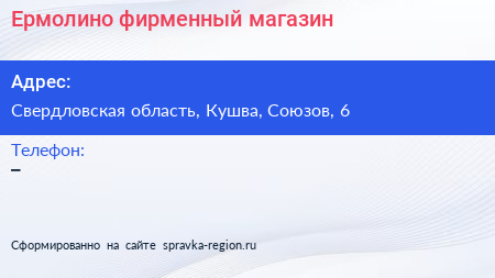 Ермолино, фирменный магазин по адресу Свердловская область, Кушва, Союзов, 6 в дальнейшем Организация, размещена в следующих категориях: