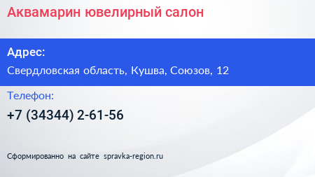 Аквамарин, ювелирный салон по адресу Свердловская область, Кушва, Союзов, 12 в дальнейшем Организация, размещена в следующих категориях: