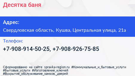 Десятка, баня по адресу Свердловская область, Кушва, Центральная улица, 21а в дальнейшем Организация, размещена в следующих категориях: