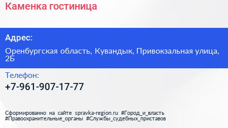 Каменка, гостиница по адресу Оренбургская область, Кувандык, Привокзальная улица, 2Б в дальнейшем Организация, размещена в следующих категориях: