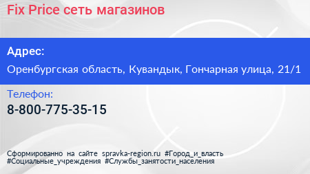 Fix Price, сеть магазинов по адресу Оренбургская область, Кувандык, Гончарная улица, 21/1 в дальнейшем Организация, размещена в следующих категориях: