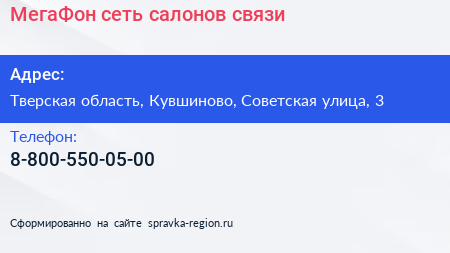 МегаФон, сеть салонов связи по адресу Тверская область, Кувшиново, Советская улица, 3 в дальнейшем Организация, размещена в следующих категориях: