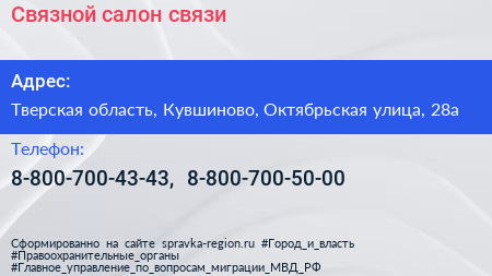 Связной, салон связи по адресу Тверская область, Кувшиново, Октябрьская улица, 28а в дальнейшем Организация, размещена в следующих категориях: