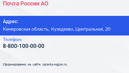 Почта России, АО по адресу Кемеровская область, Кузедеево, Центральная, 20 в дальнейшем Организация, размещена в следующих категориях: