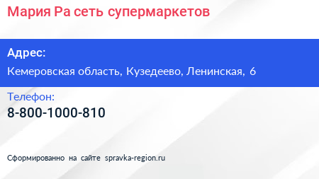 Мария-Ра, сеть супермаркетов по адресу Кемеровская область, Кузедеево, Ленинская, 6 в дальнейшем Организация, размещена в следующих категориях: