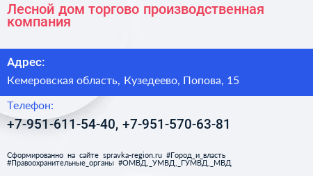 Лесной дом, торгово-производственная компания по адресу Кемеровская область, Кузедеево, Попова, 15 в дальнейшем Организация, размещена в следующих категориях: