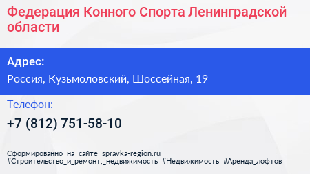 Федерация Конного Спорта Ленинградской области по адресу Конно-спортивный клуб Дерби, 41К-075, Городок, Бугровское городское поселение, Всеволожский район, Ленинградская область, Северо-Западный федеральный округ, 188660, Россия в дальнейшем Организация, размещена в следующих категориях: