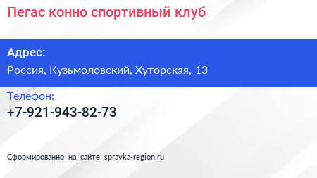 Пегас, конно-спортивный клуб по адресу Конно-спортивный клуб Пегас, Горная улица, Мистолово, Бугровское городское поселение, Всеволожский район, Ленинградская область, Северо-Западный федеральный округ, 188660, Россия в дальнейшем Организация, размещена в следующих категориях: