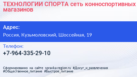 ТЕХНОЛОГИИ СПОРТА, сеть конноспортивных магазинов по адресу Конно-спортивный клуб Дерби, 41К-075, Городок, Бугровское городское поселение, Всеволожский район, Ленинградская область, Северо-Западный федеральный округ, 188660, Россия в дальнейшем Организация, размещена в следующих категориях: