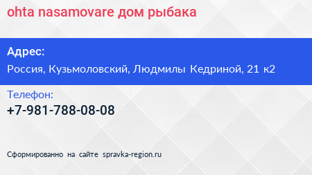 ohta nasamovare, дом рыбака по адресу улица Людмилы Кедриной, Мистолово, Бугровское городское поселение, Всеволожский район, Ленинградская область, Северо-Западный федеральный округ, 188660, Россия в дальнейшем Организация, размещена в следующих категориях: